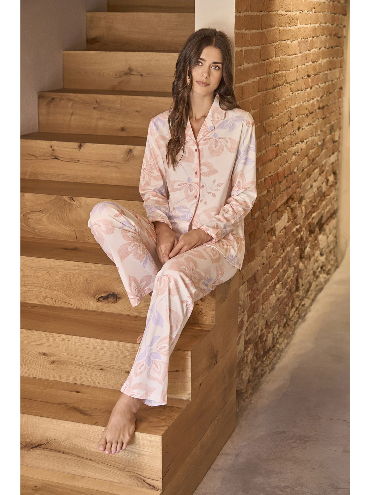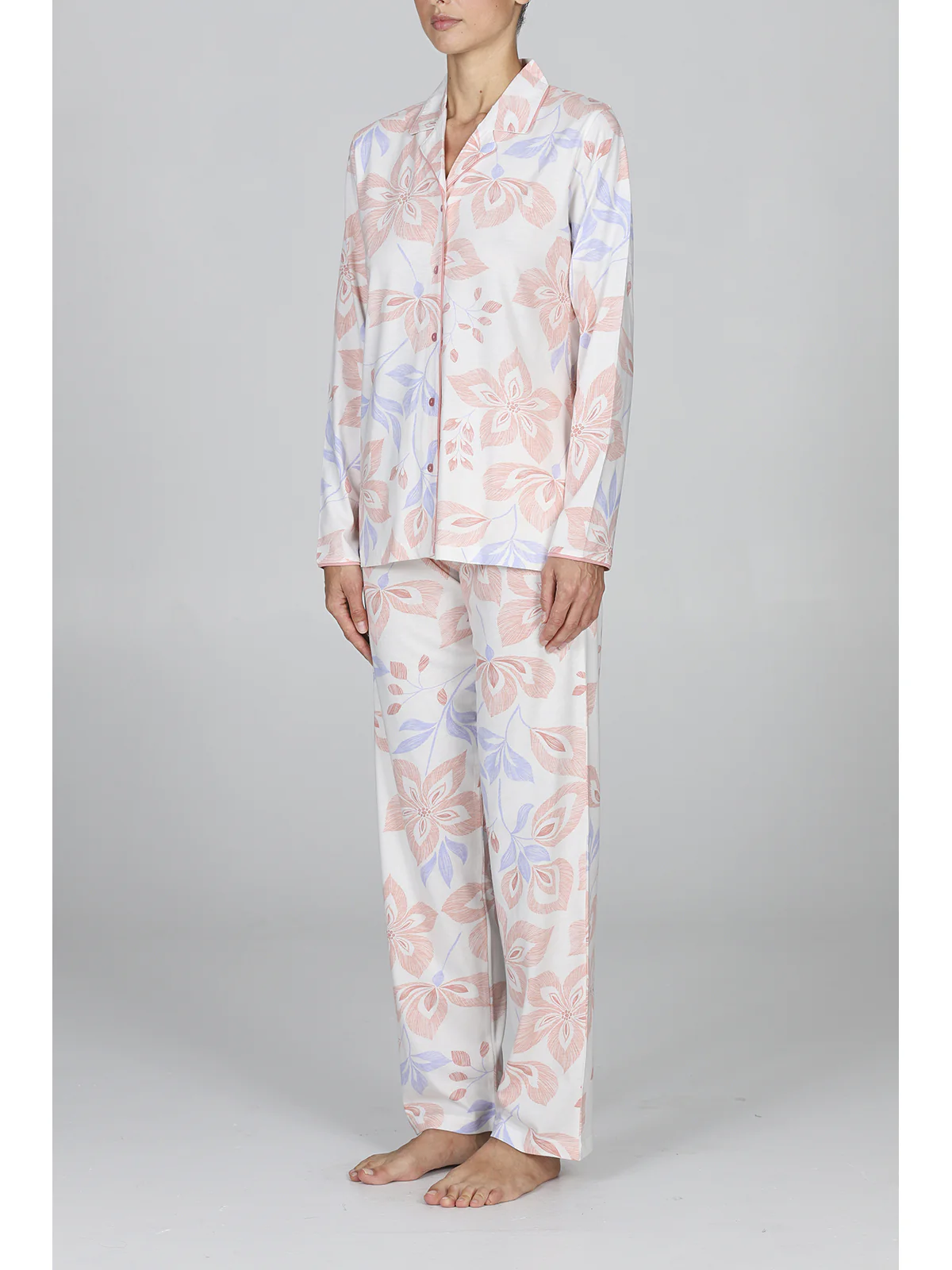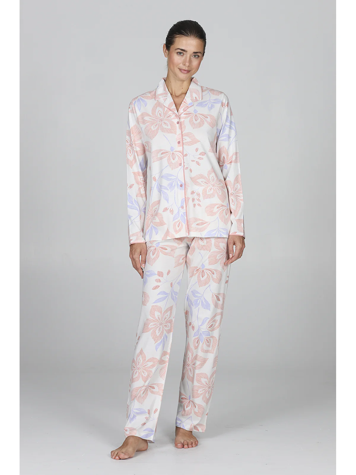 Long women’s pajama in fresh 30/1 jersey made of combed pure cotton. Fabric in elegant floral pattern with shiny satin trim. Cardigan model with collar and lapels: fully openable. Long pants. Modern comfort for a classic femininity signed by Alpina.