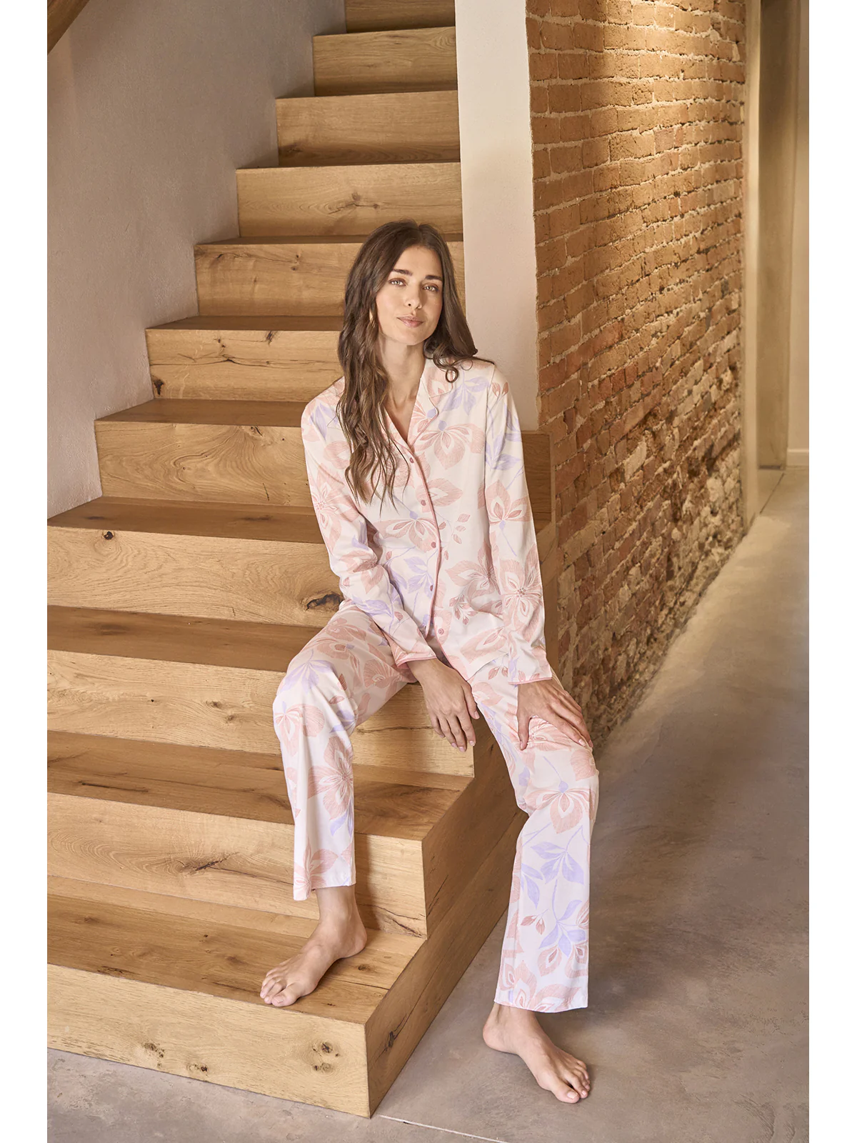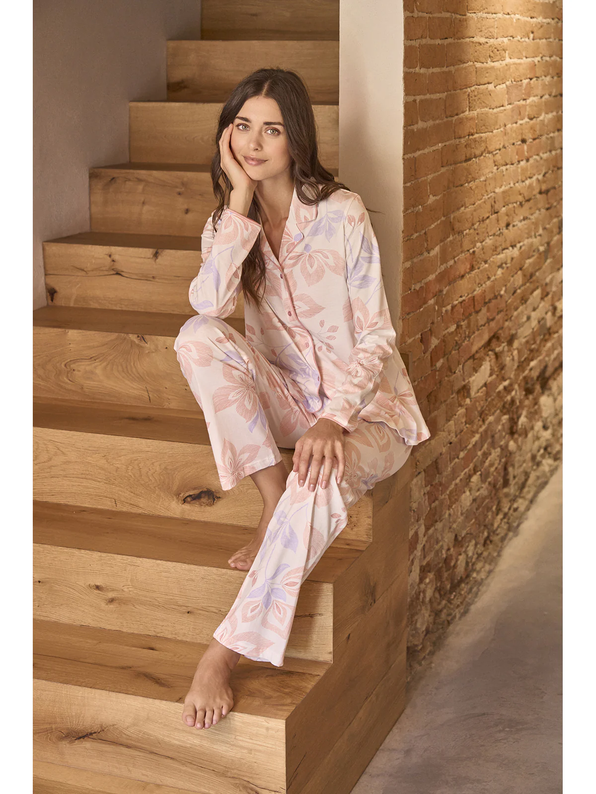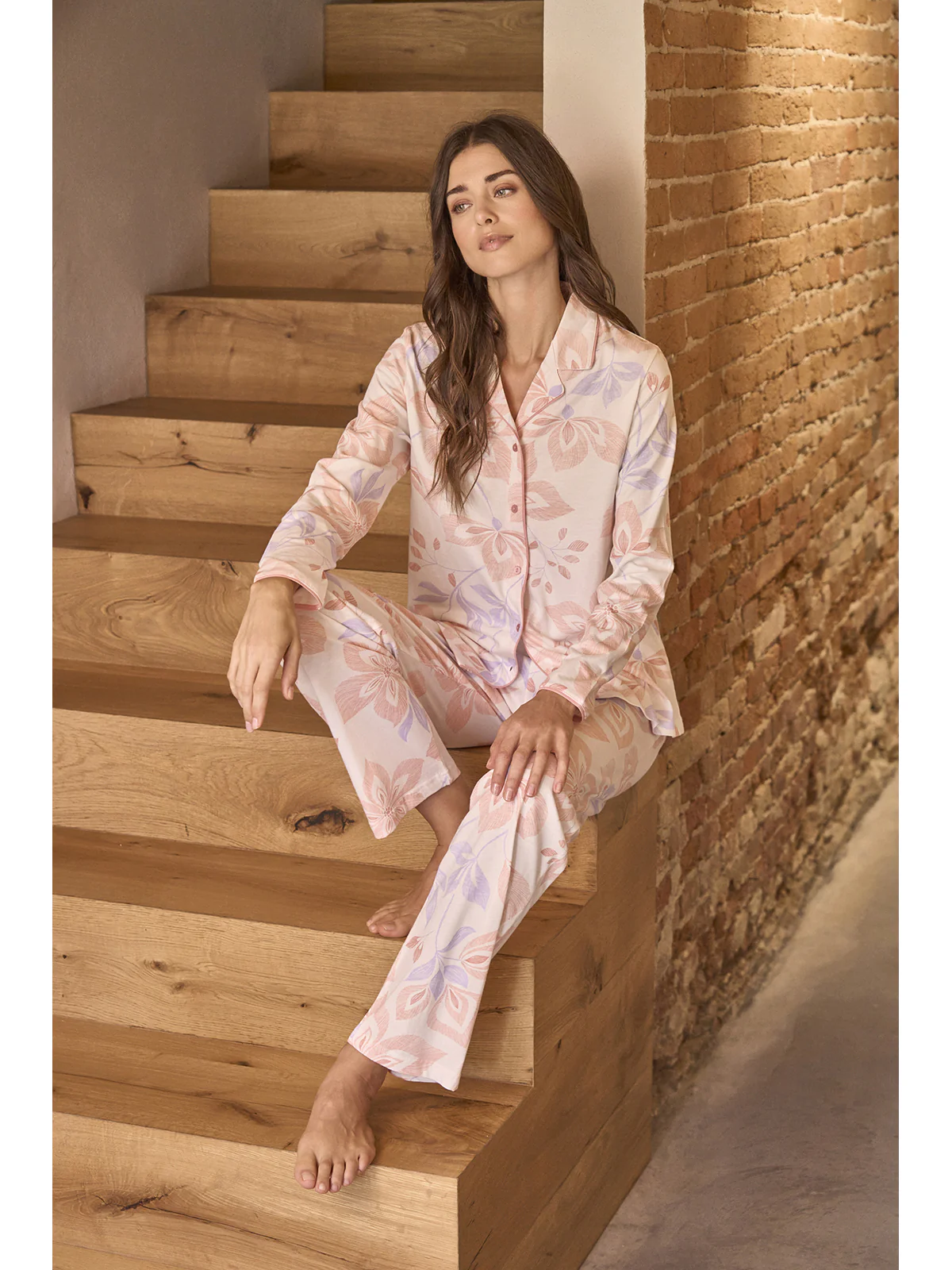 Long women’s pajama in fresh 30/1 jersey made of combed pure cotton. Fabric in elegant floral pattern with shiny satin trim. Cardigan model with collar and lapels: fully openable. Long pants. Modern comfort for a classic femininity signed by Alpina.