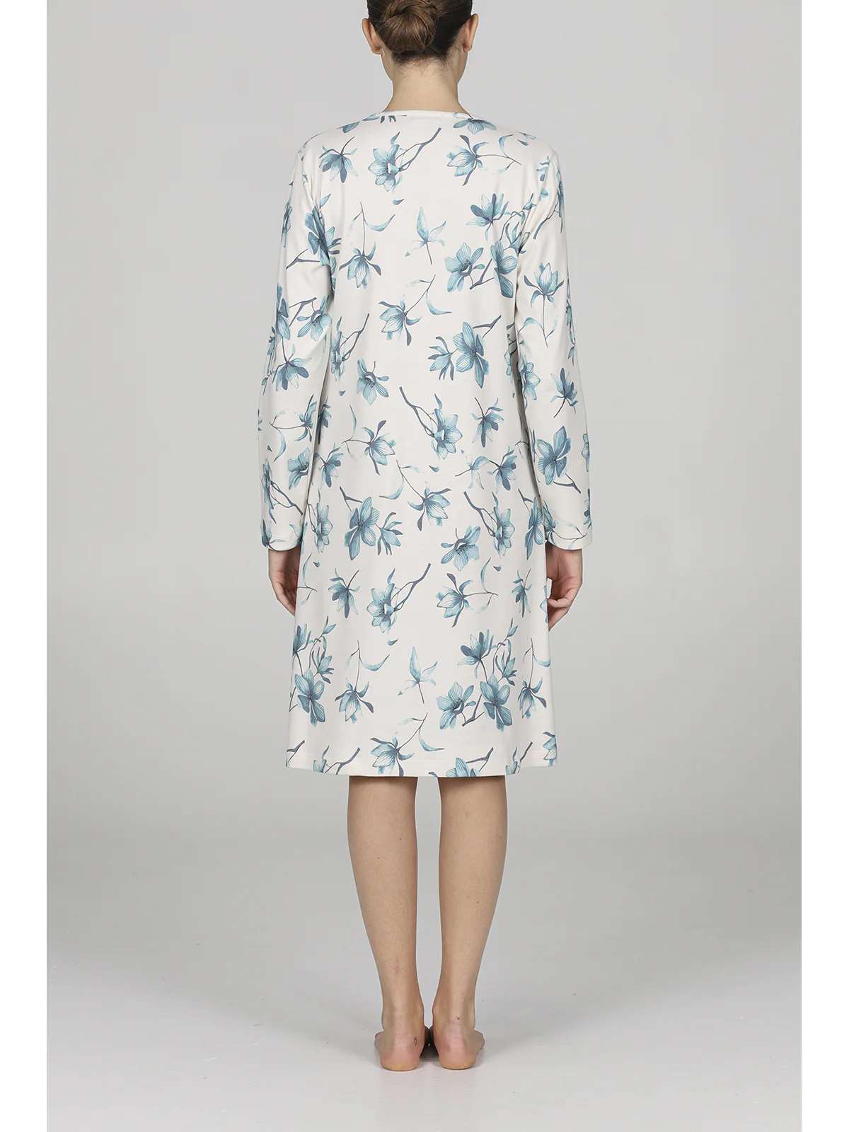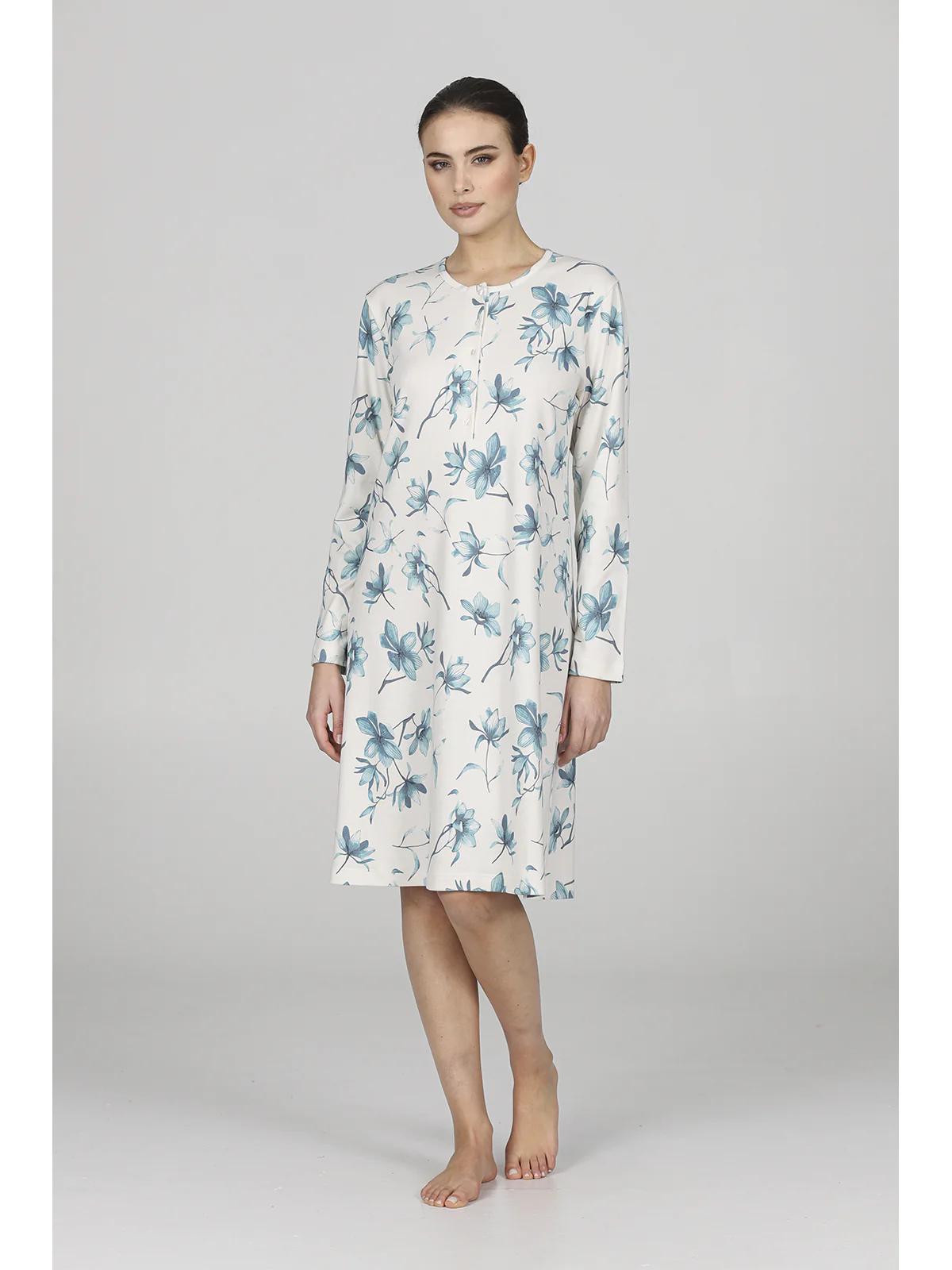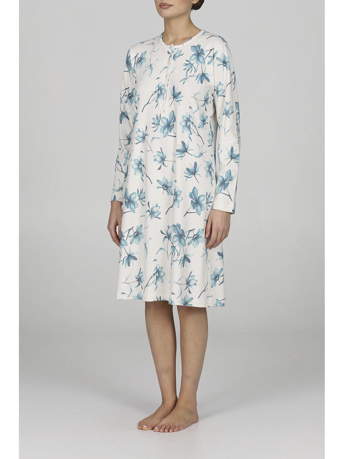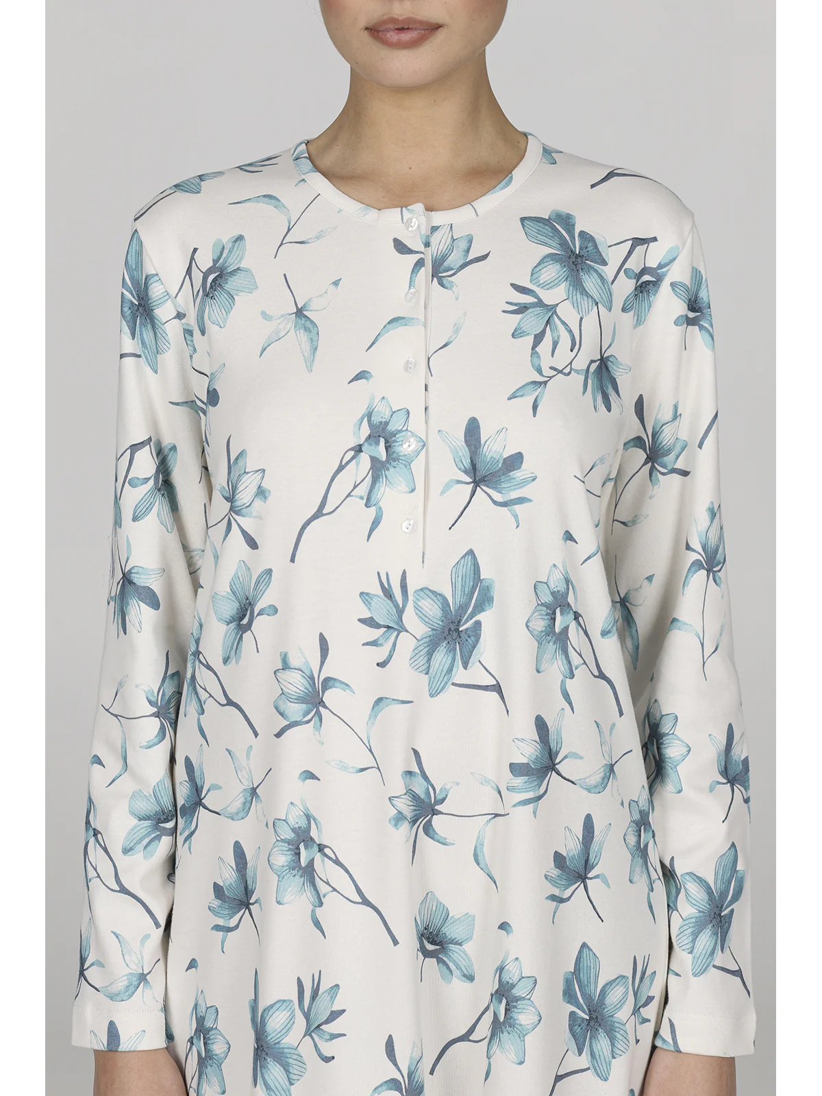 Women’s nightgown in interlock 30/1 of pure cotton: warm and comfortable, suitable for the night and lounging at home. Model with deep Henley neckline. Length cm.100 Refined style in romantic floral pattern. Ideal for the most demanding individuals. Quality and tradition signed by Alpina.