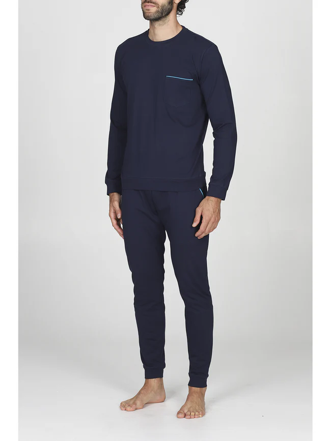 Men’s long pajamas in breathable and cool 30/1 pure cotton jersey. Jacket with a practical henley neckline, three-button placket, and solid-color trousers. A classic and refined piece from Alpina.