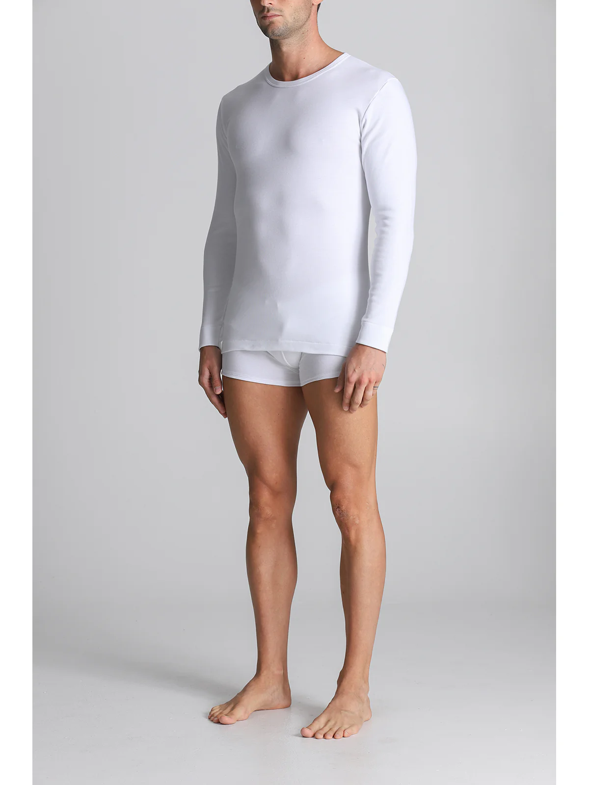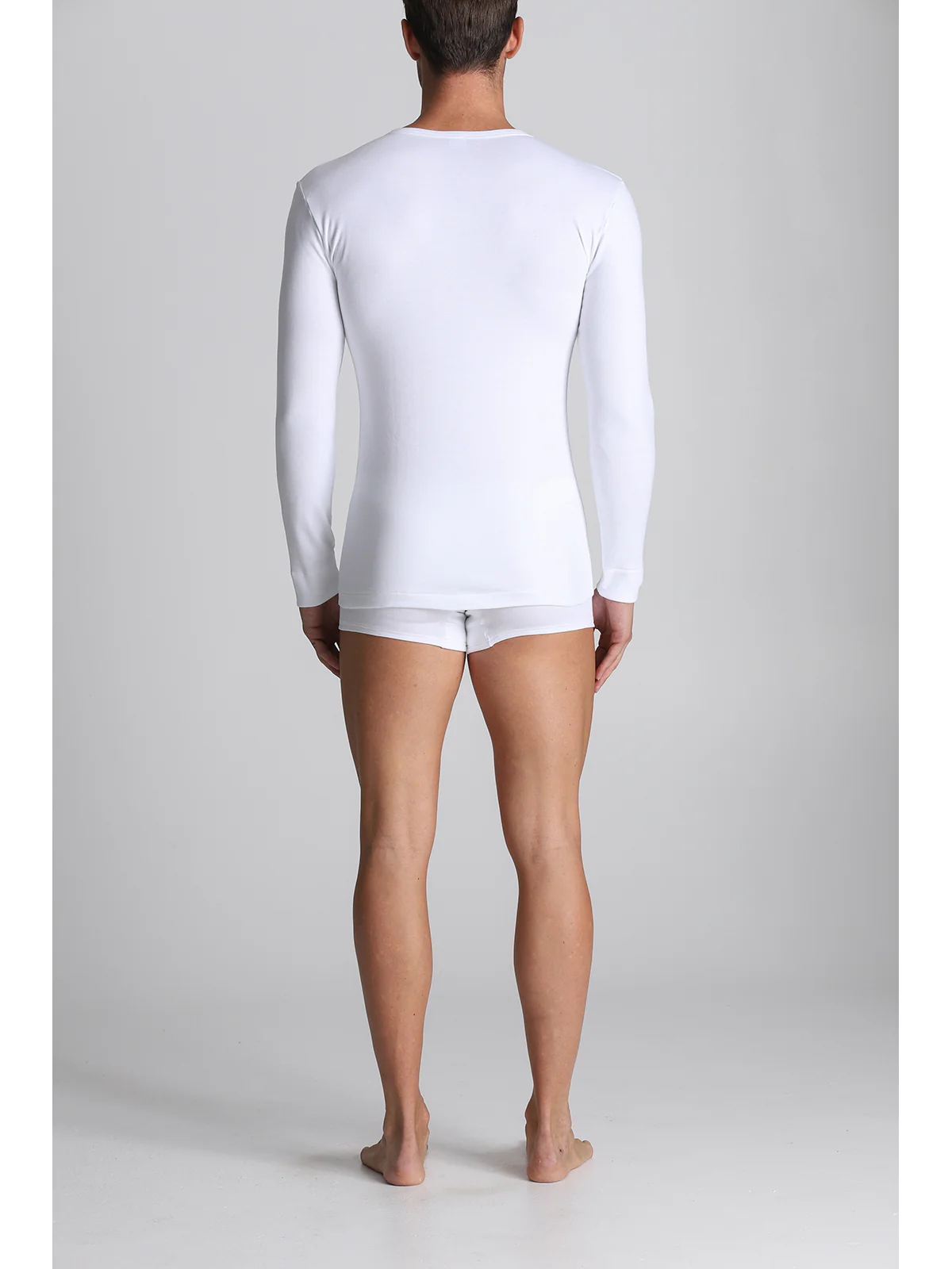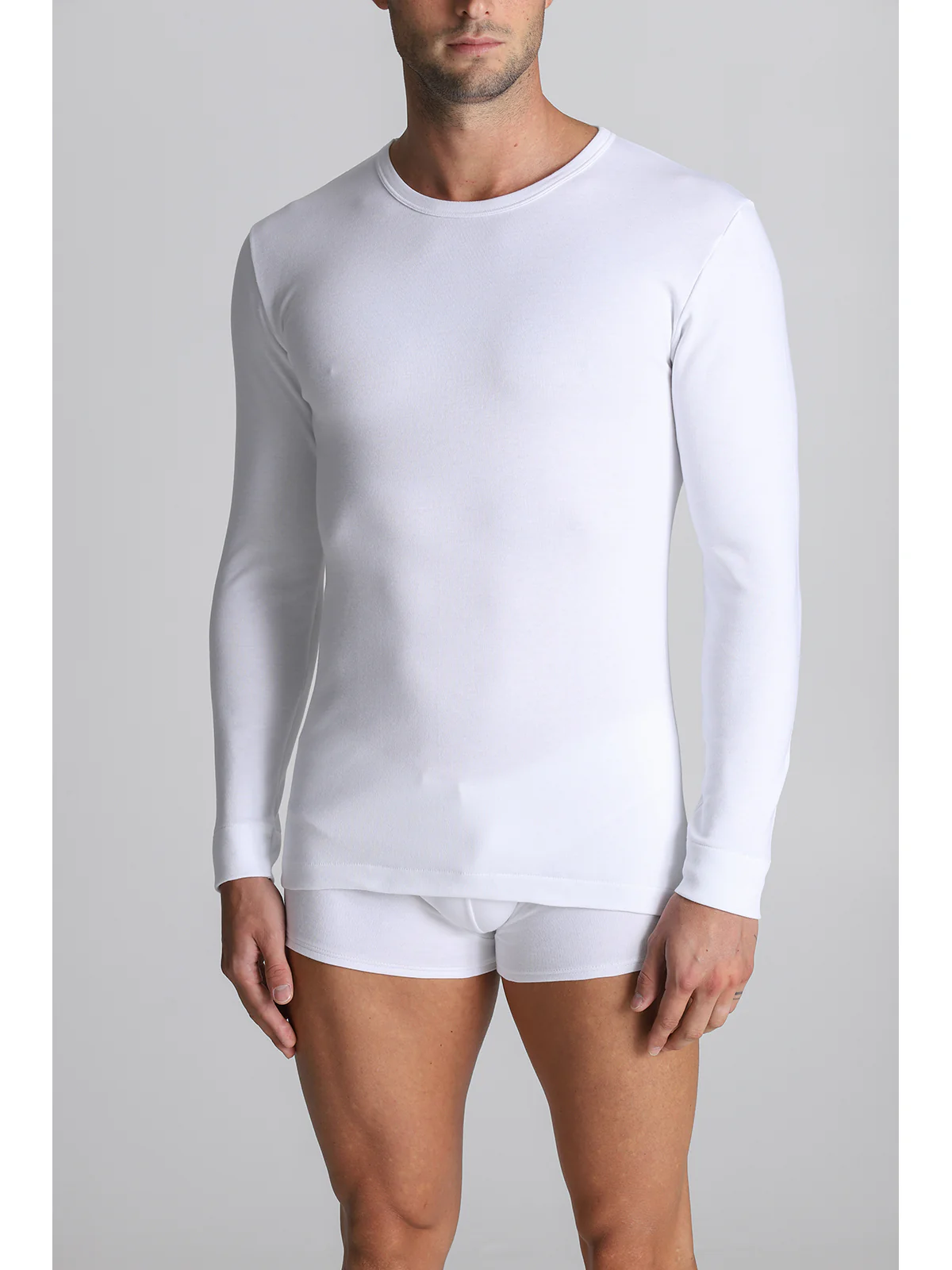 Men’s long-sleeved T-shirt in pure cotton interlock. The brushing process creates tiny cottony curls that make the fabric softer and warmer, which is why we call it warm cotton.