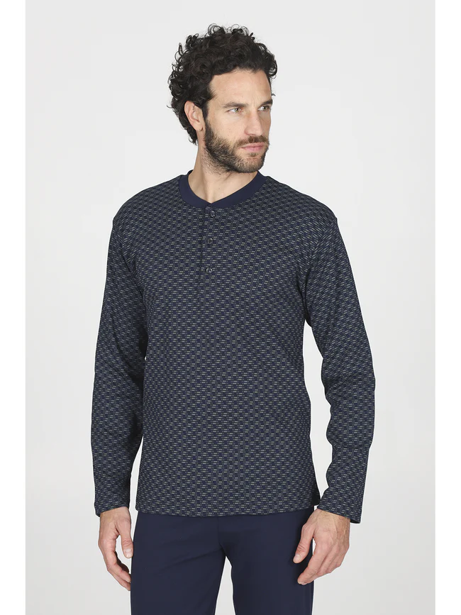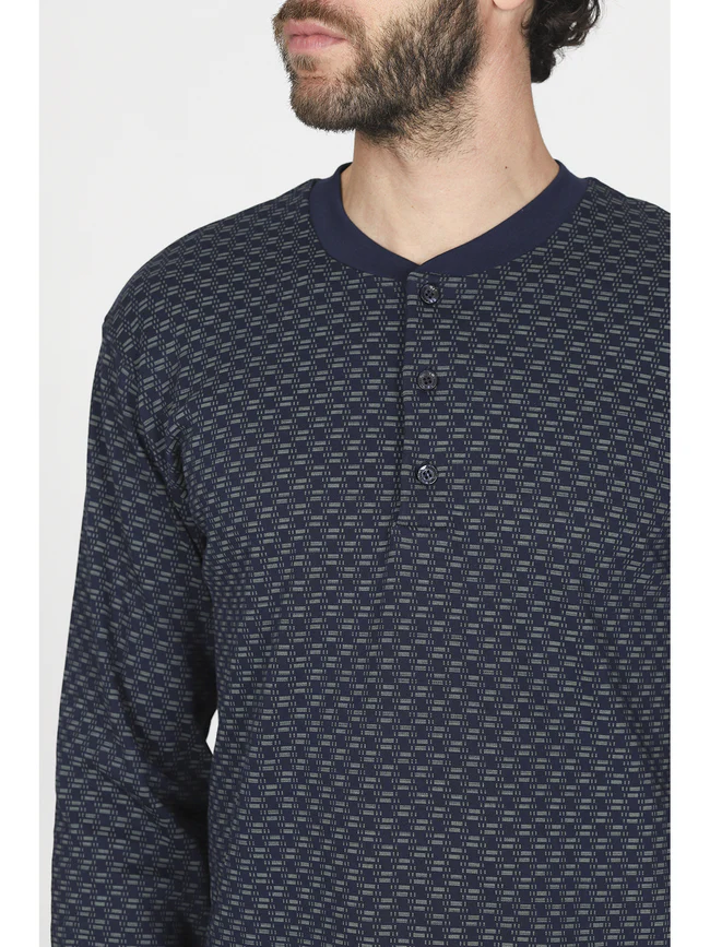 Men’s pajamas in 36/1 pure cotton interlock: natural, soft, warm, and comfortable. Long design with a henley shirt without hems and cuffs. Long trousers with solid-color hems. Suitable for the colder seasons: a winter must-have!