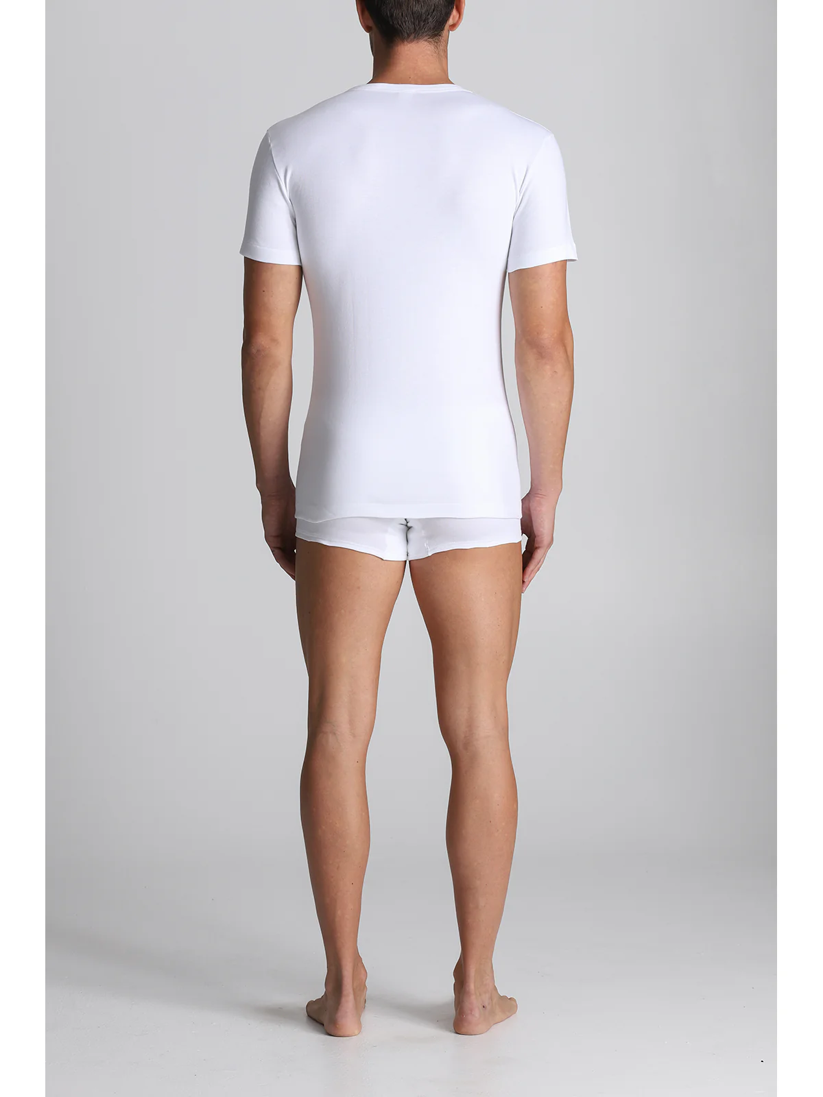 Men’s V-neck short-sleeve T-shirt in pure cotton interlock. The brushing process creates tiny cottony curls that make the fabric softer and warmer, which is why we call it warm cotton.