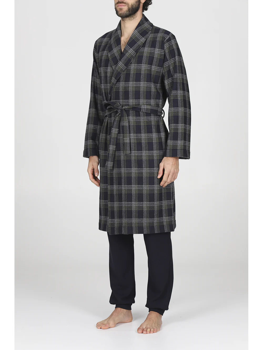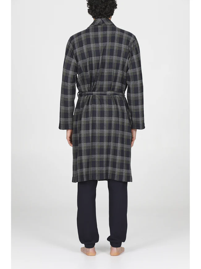 Men’s cotton jacquard dressing gown: warm, soft, and elegant. Long design in an elegant tartan pattern with a shawl collar and practical side pockets. Belt and belt loop closure. Alpina quality and comfort.