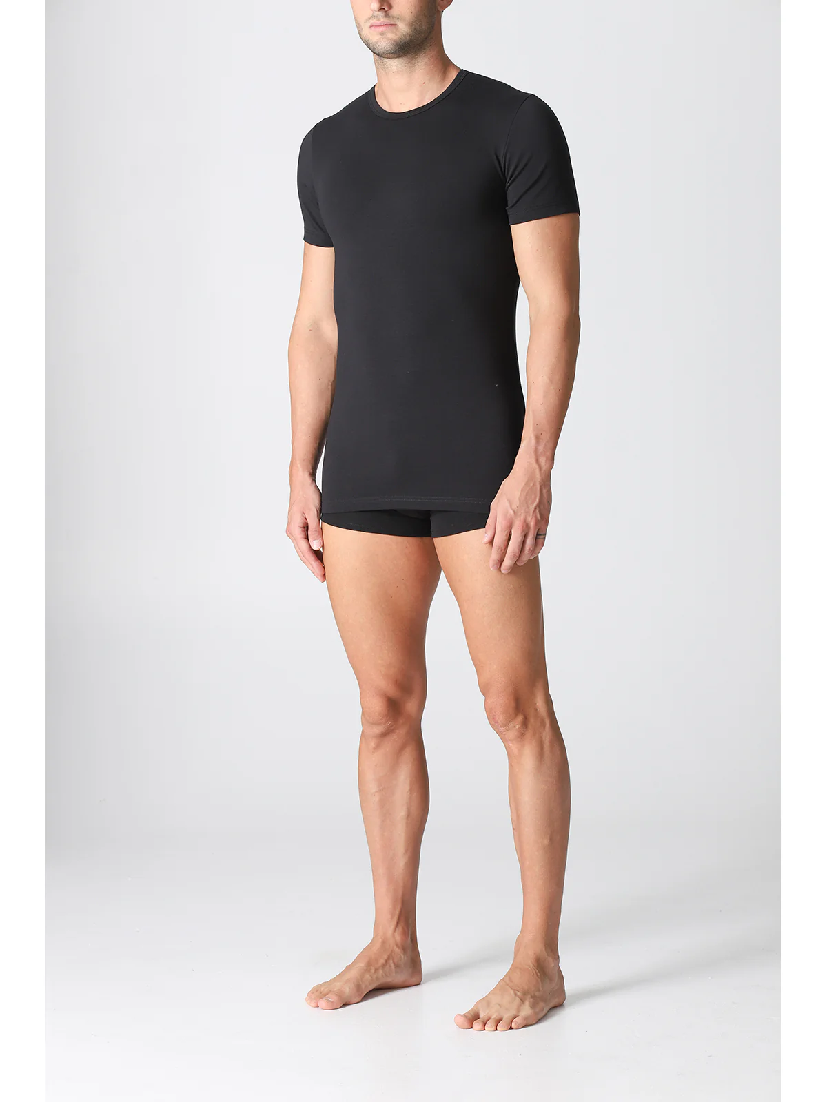 Short-sleeved T-shirt in warm, stretchy cotton fleece. The brushing process creates tiny, cottony curls that make the fabric softer, providing a warm feel without sacrificing the practicality of stretch cotton.