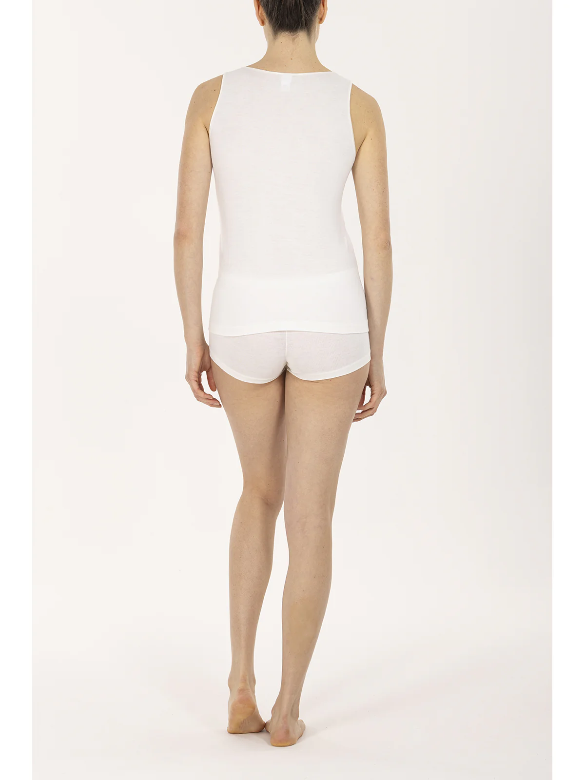 Women’s intimate tank top with wide straps in soft double layer: warm wool outside and soft cotton against the skin. Refined lace neckline for a classic elegance that is never trivial.