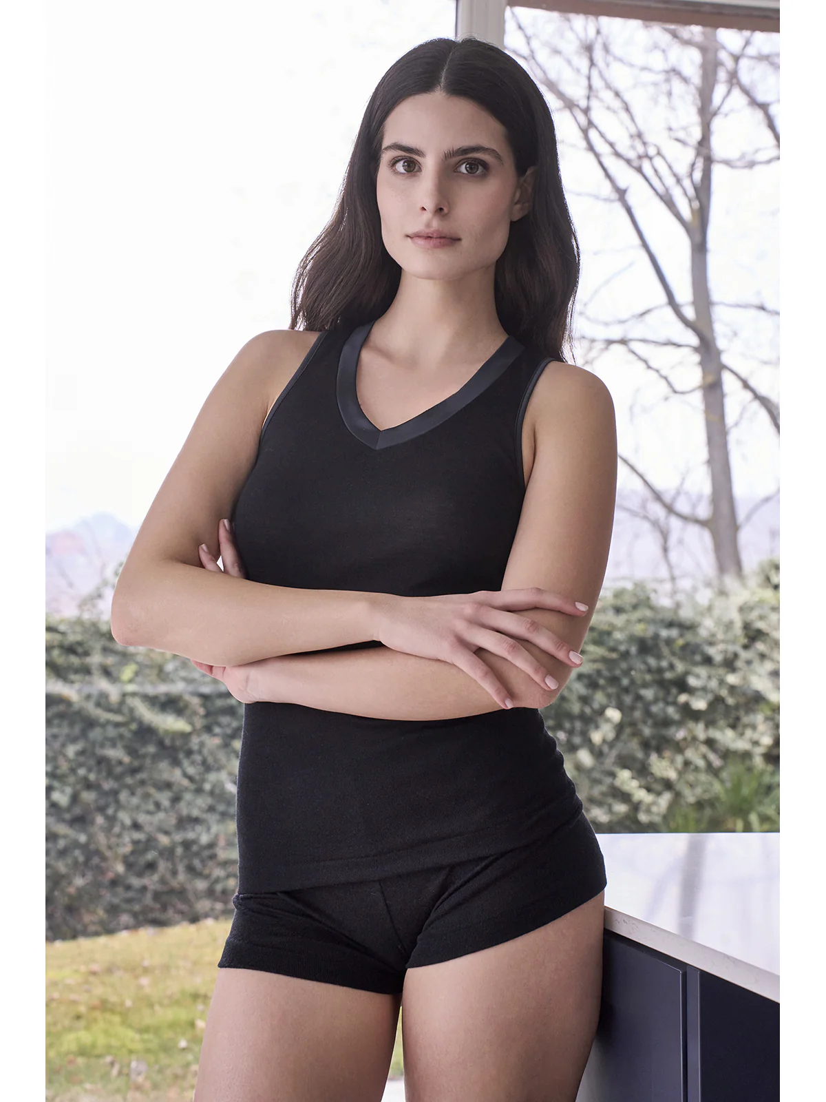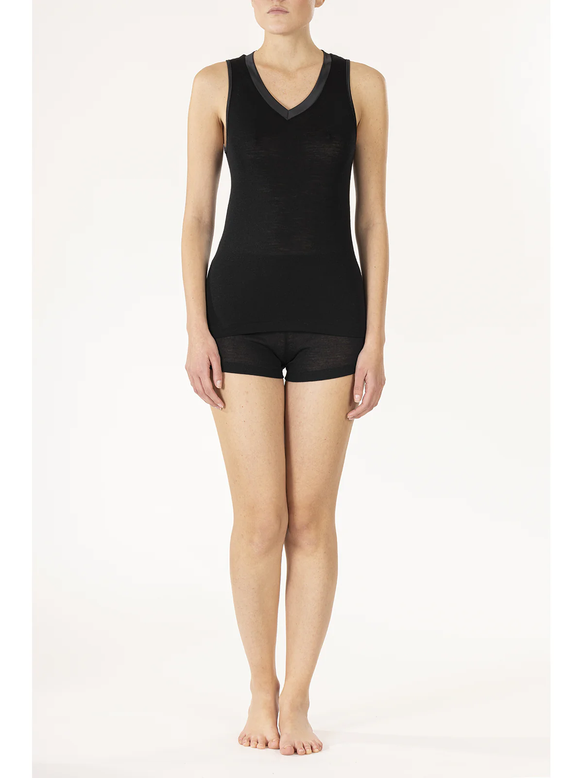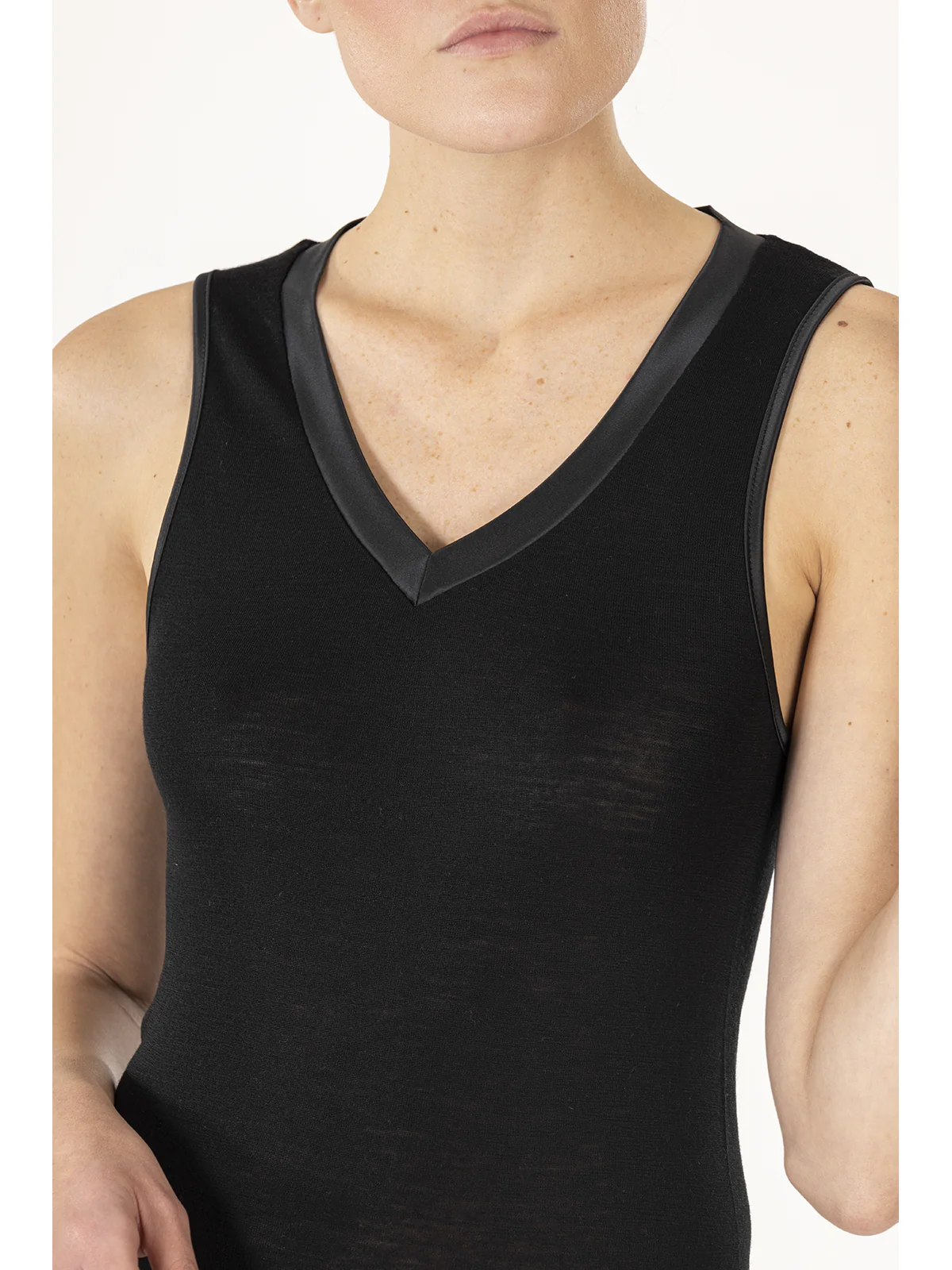 Women’s intimate tank top model with wide straps made of wool and silk for maximum comfort and warmth. Elegant satin neckline. All the warmth of wool without sacrificing the shine of silk. Only natural fibers on your skin.