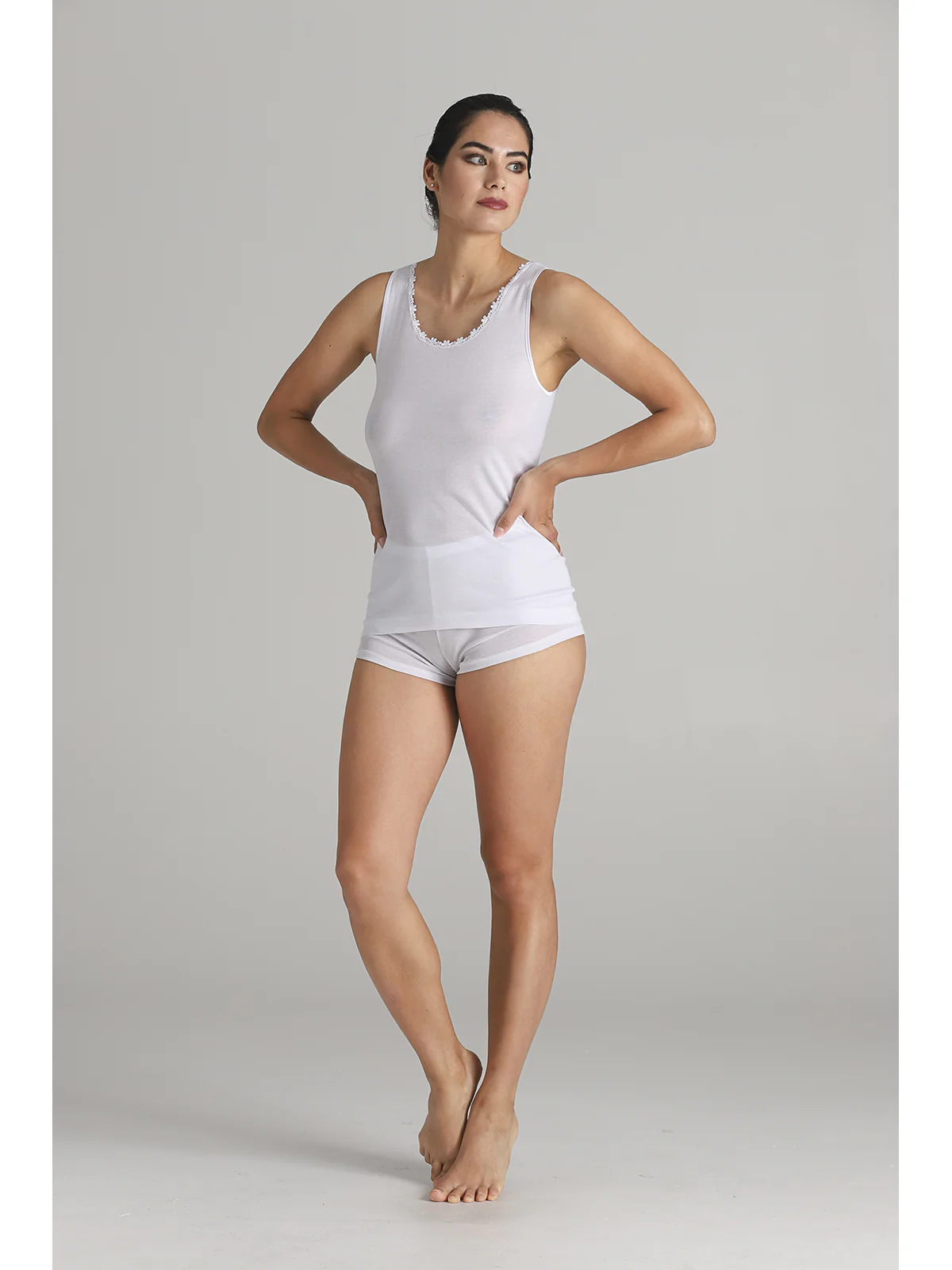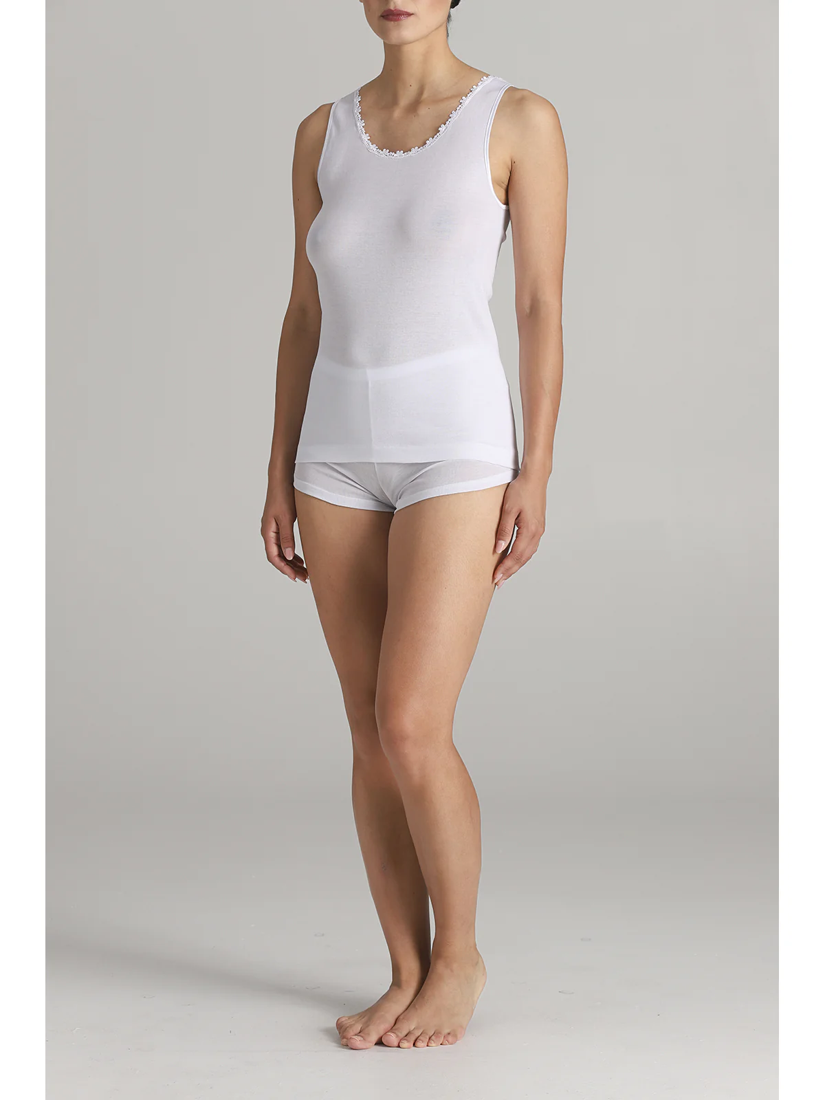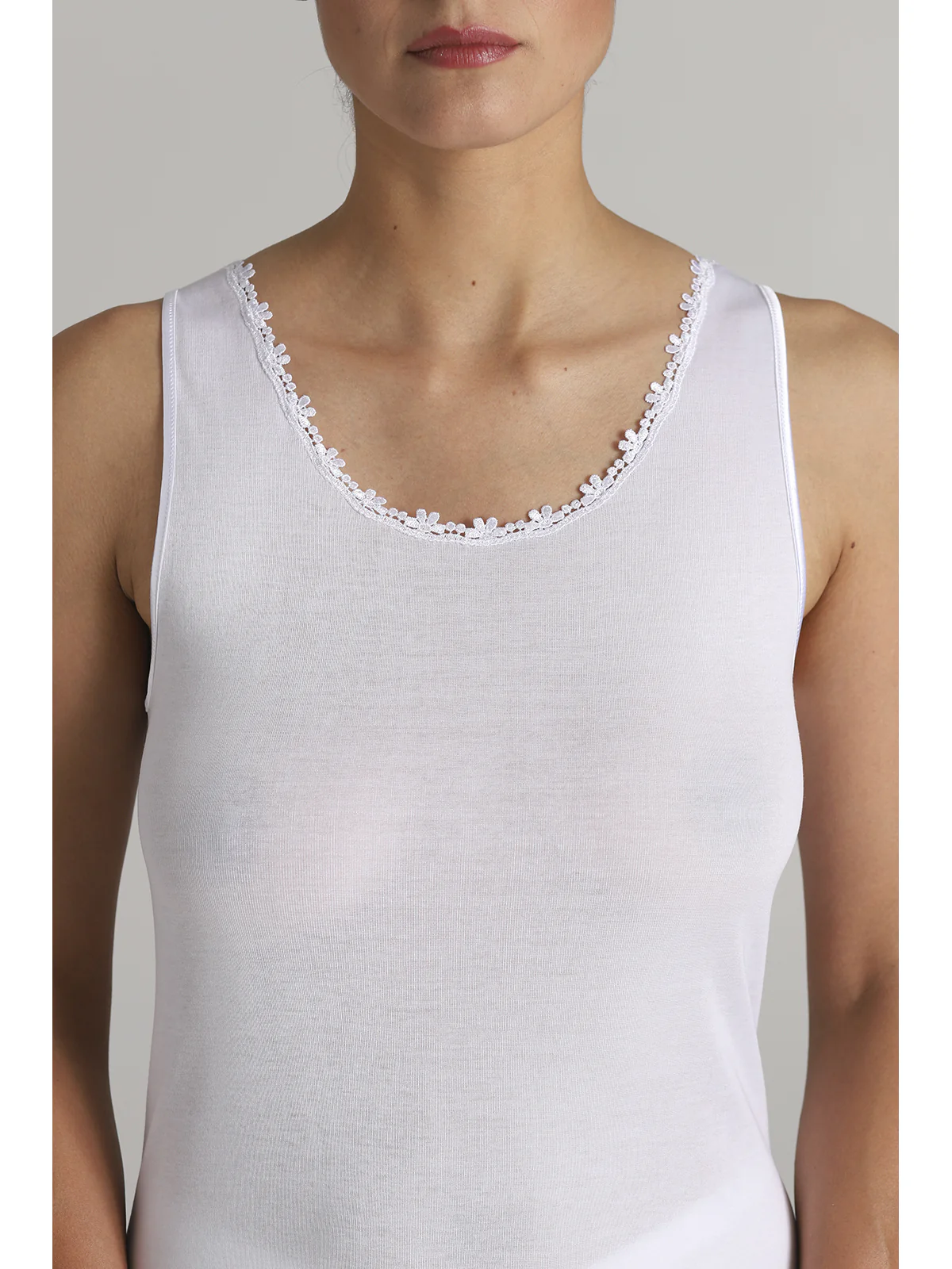 Women’s tank top with narrow straps in high-quality certified filodoro, featuring a low macramé insert on the neckline. Soft and pleasant to the touch, it is one of the most suitable fabrics for allergy sufferers. Shine, durability over time, and purity of fibers with antibacterial properties are its best qualities.