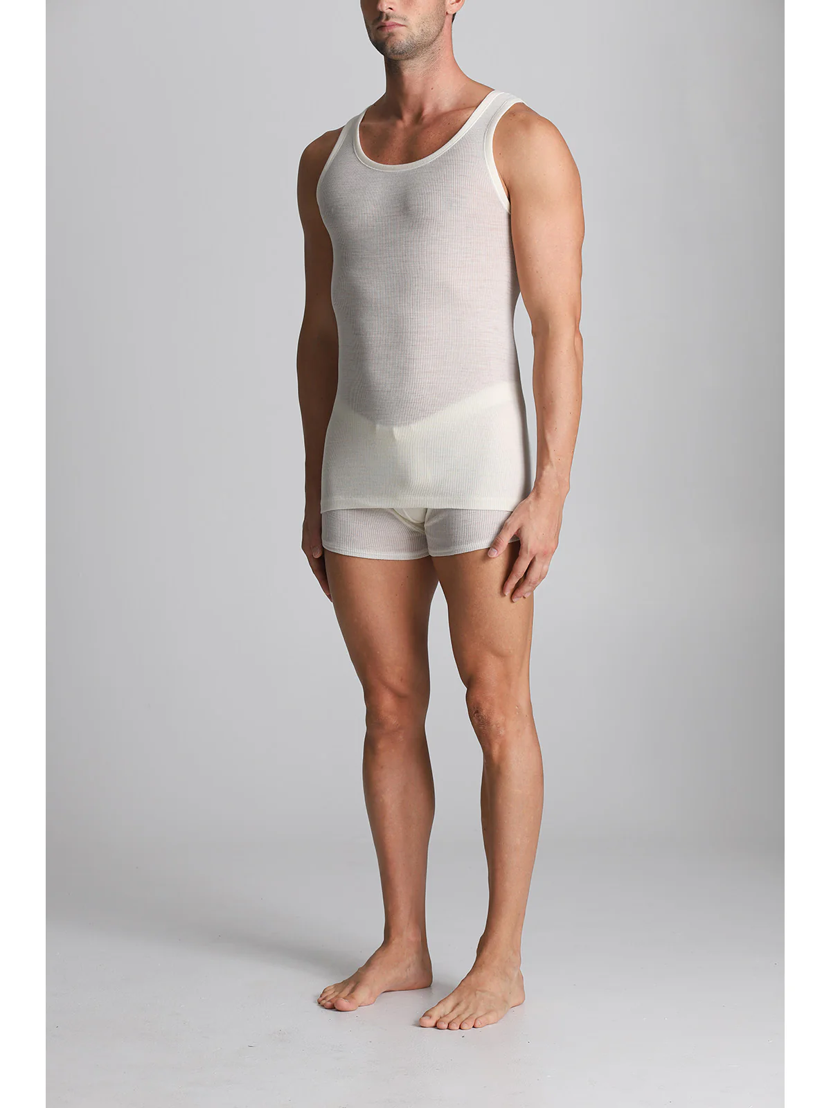 Racerback tank top in 2×2 ribbed wool blend. All the warmth of wool combined with the practicality of other fibers, for unique comfort. Classic style.